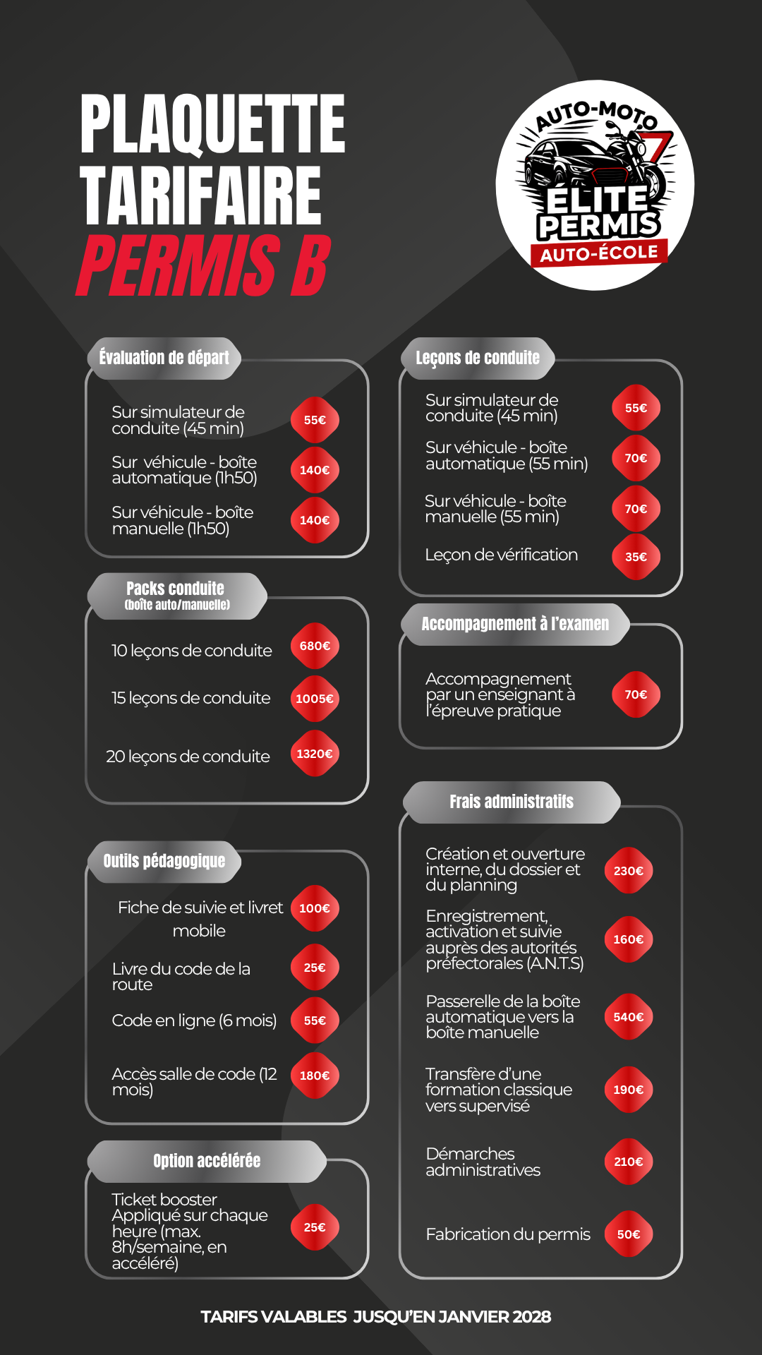 L’ensemble des coûts et des étapes du processus d’apprentissage de la conduite sont présentés de manière transparente, sans frais cachés ni mauvaises surprises pour les élèves.